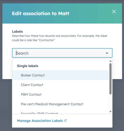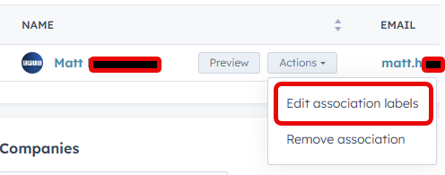 To do this, hover over the contact or company name within the deal and then click Actions > Edit association labels.