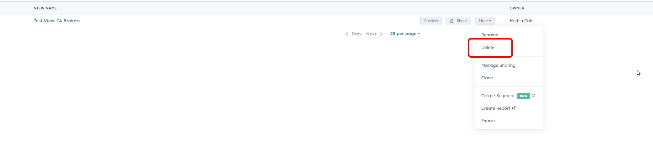 9. If you ever want to delete a view, follow the same steps to find the view in CRM > Contacts > All Views and search for the view you want to delete.