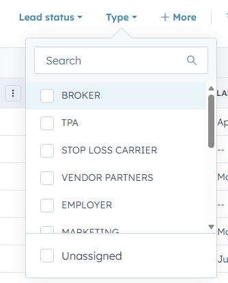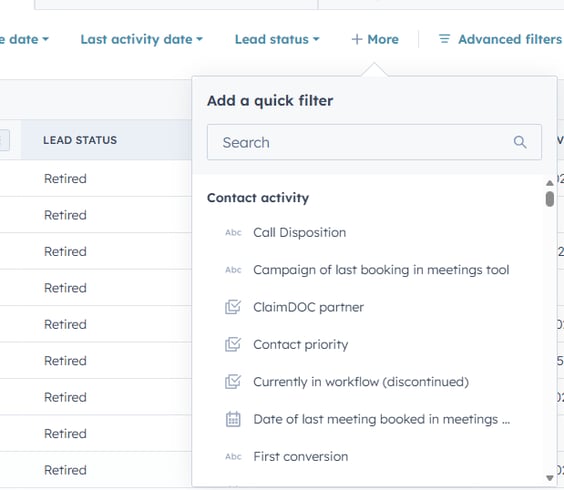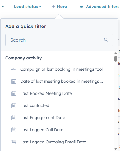 8. You can use these same instructions to add any filter of your choosing. Simply follow the same steps and then search for your preferred filter (i.e. company name, lifecycle stage, etc).