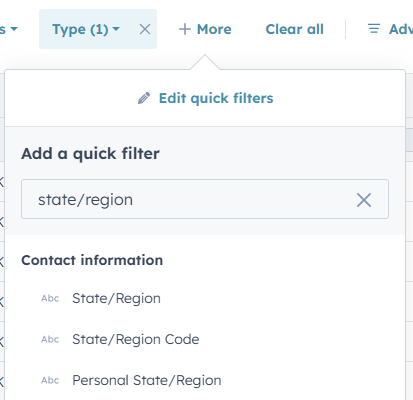 Go back to More and search State/Region and select it to add as a filter option (the same way you did for Type)